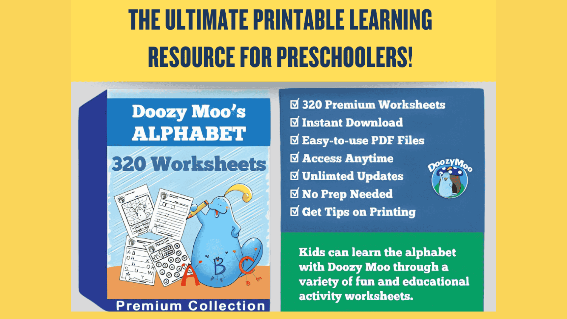 Help your child master the alphabet with Doozy Moo's 320 Alphabet Worksheets! Designed for fun and effective learning, these worksheets cover essential skills like letter tracing, missing letters, alphabet mazes, coloring pages, connect the dots, and more. Perfect for teaching, assessment, or review, this engaging resource makes learning ABCs exciting for kids. Download and start learning today!